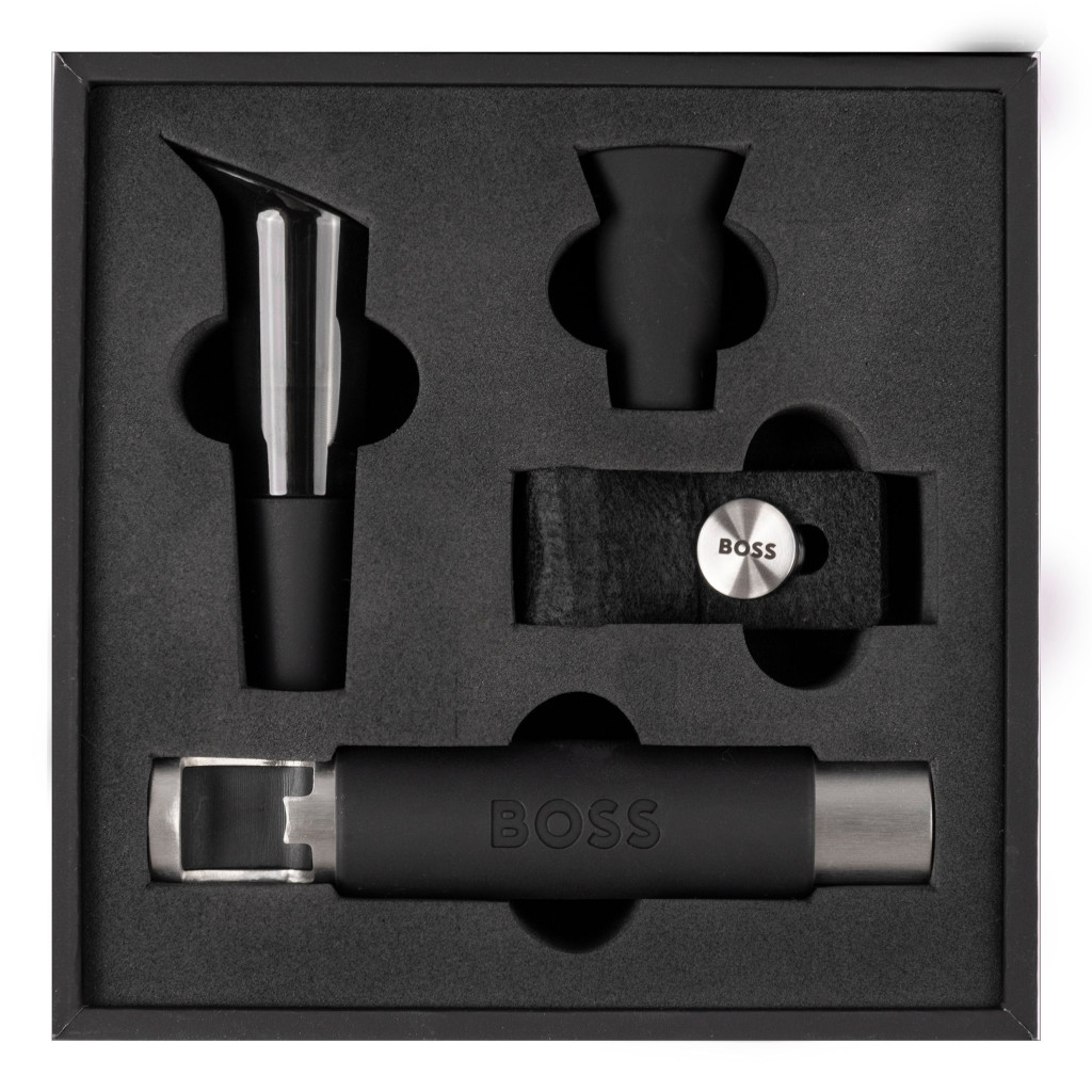 A BOSS Iconic bornyitó szett elegáns és tartós kialakítású szálcsiszolt acél részletei garantálják az eseményekhez illő hangulatot. A BOSS díszdobozban érkező készlet tartalma: Szálcsiszolt acél dugóhúzó könnyed és precíz nyitásért; Gumibetétes palackzáró az ital frissességének megőrzésére;