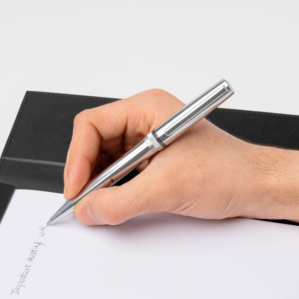 A HUGO BOSS Gear golyóstoll dinamikus, áramvonalas formatervezésével az aktív életstílust testesíti meg. Fényes króm felülete és elegáns, sötét krómgyűrűje pedig tovább emeli a modern és letisztult megjelenését, kifinomult stílust sugározva minden használat során.