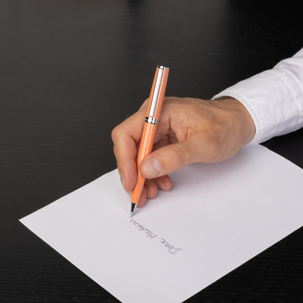 A HUGO BOSS Gear Icon golyóstoll az időtlen elegancia méltó védjegye most egy letisztultabb, modernebb, fényes lakkozott külsővel hódit. A minimalista dizájn, a kifinomult sziluett, a konvencionális színek igazi klasszikus megjelenésű íróeszközzé teszik, míg számos vidám új színe igazán friss, élénk dinamizmusról árulkodik. A golyóstoll gyönyörű pasztell narancssárga árnyalatban garantáltan vidám hangulatot kelt.