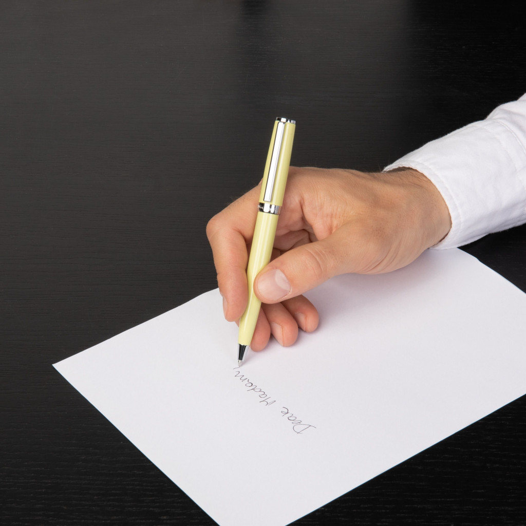 A HUGO BOSS Gear Icon golyóstoll az időtlen elegancia méltó védjegye most egy letisztultabb, modernebb, fényes lakkozott külsővel hódit. A minimalista dizájn, a kifinomult sziluett, a konvencionális színek igazi klasszikus megjelenésű íróeszközzé teszik, míg számos vidám új színe igazán friss, élénk dinamizmusról árulkodik. A golyóstoll lágy pasztell sárga árnyalata vidám és kifinomult eleganciát sugároz, tökéletes választás a stílusos és napfényes megjelenésért.