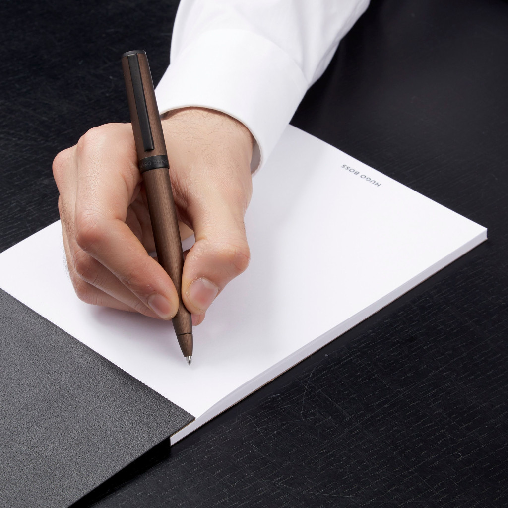 A HUGO BOSS Gear Brushed golyóstoll letisztult, egyszerű és minimalista megjelenést kínál. A modern szálcsiszolt alumínium felületek és a semleges, harmonikus színkombináció elegáns hatást kelt. Ez a barna változat, mattfekete részletekkel, kifejezetten trendi és modern megjelenést biztosít.